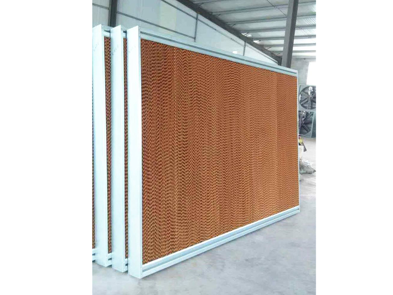 該系統(tǒng)由濕簾、供回水系統(tǒng)、風(fēng)機(jī)和附件、電動(dòng)控制系統(tǒng)組成。利用水的蒸發(fā)通過(guò)熱濕交換的原理,給空氣加濕和降溫。系統(tǒng)通過(guò)循環(huán)供水將水送到濕簾頂部,均勻淋濕整個(gè)濕簾墻,從而將濕簾的表面濕潤(rùn)。當(dāng)空氣通過(guò)潮濕的濕簾時(shí),水與空氣充分接觸,使空氣的溫度降低,達(dá)到降溫的目的。