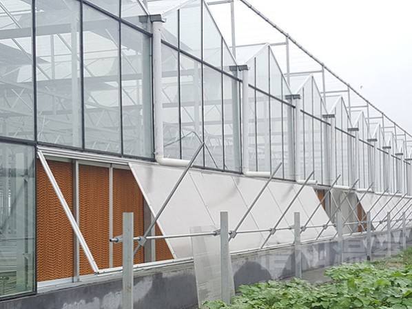 連續開窗系統,由若干排齒輪齒條,在驅動軸的帶動下,將溫室窗戶進行開啟。連續開窗適用于各種類型的溫室,可有效提高溫室通風面積,達到增加溫室通風降溫的效果。主要設備配件有減速電機、傳動軸、齒條、齒輪、軸承座等。扭距分配式開窗系統是連續式開窗的一種,由一臺減速電機驅動一系列扭距分配器,扭距分配器作用于連續開窗的驅動軸,實現開窗。交錯開窗系統又稱為推桿開窗系統,適用于Venlo型溫室。開窗時,齒輪齒條在驅動軸帶動下運動,推動推桿向前運動,在支撐臂的作用下,將窗戶打開。交錯式開窗僅適用于頂開窗系統。交錯式開窗因齒輪齒條機構不同而分為軌道式和擺臂式兩種形式。二者主要區別于,前者單根齒條推力大,可適用長度較大的溫室,后者適用于長度較小,但結構簡單,造價較低。系統組成:齒輪、齒條、推拉桿、減速電機、驅動軸、支撐臂等附件。