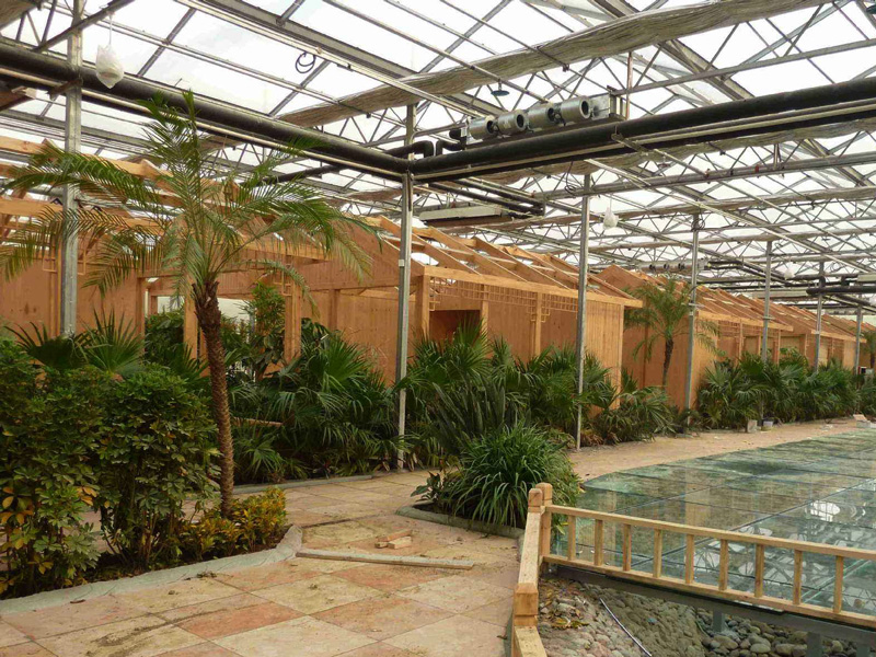 綠色生態餐廳中廳采用大型鋼結構形式,跨度大,高度高、可植入高大樹木,設置亭臺,造景時有更大的發揮空間,使景色更加逼真。中廳周圍設置其他配套連棟溫室,大部分餐飲設置于其中,降低大大的造價和后期維護費用,同時保證了充足的活動空間,美景美食交相輝映,相得益彰。